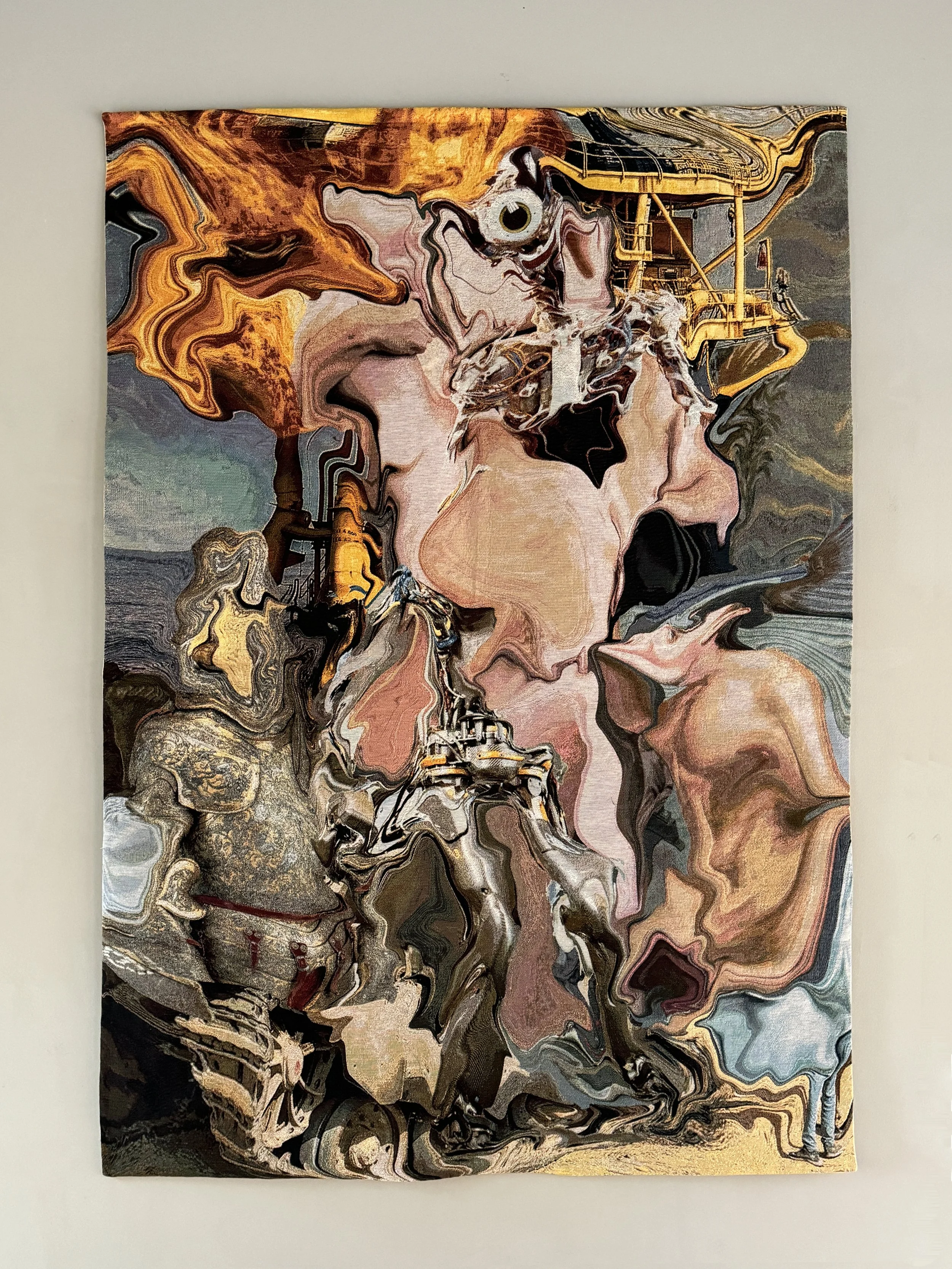 In this sense, the tapestry performs what Max Ernst called “complete transmutation”—a poetic collision of incompatible realities. Where Ernst described the Surrealist collage as the chance encounter between a sewing machine and an umbrella on a dissecting table, The model collapse series dissects the table itself. The result is not just uncanny, but ontologically unstable: a tapestry that dreams of painting, a botanical form made of prosthetics, a digital image that carries the gravity of myth.